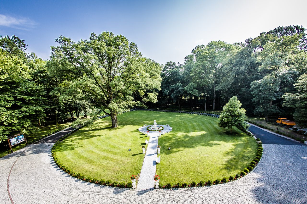 Auf den Säulen am Einfahrtstor befestigte man zwei steinerne Wildschweine, die ein Teil des Wappens der ehrenhaften Familie von Strachwitz sind. Auf der anderen Seite des Tores erweitert sich eine riesige 11 ha große Parkanlage. Auf dieser Fläche wachsen Bäume mit edler Herkunft und seltene Büsche. Unter ihnen befinden sich mehrere Naturdenkmäler.